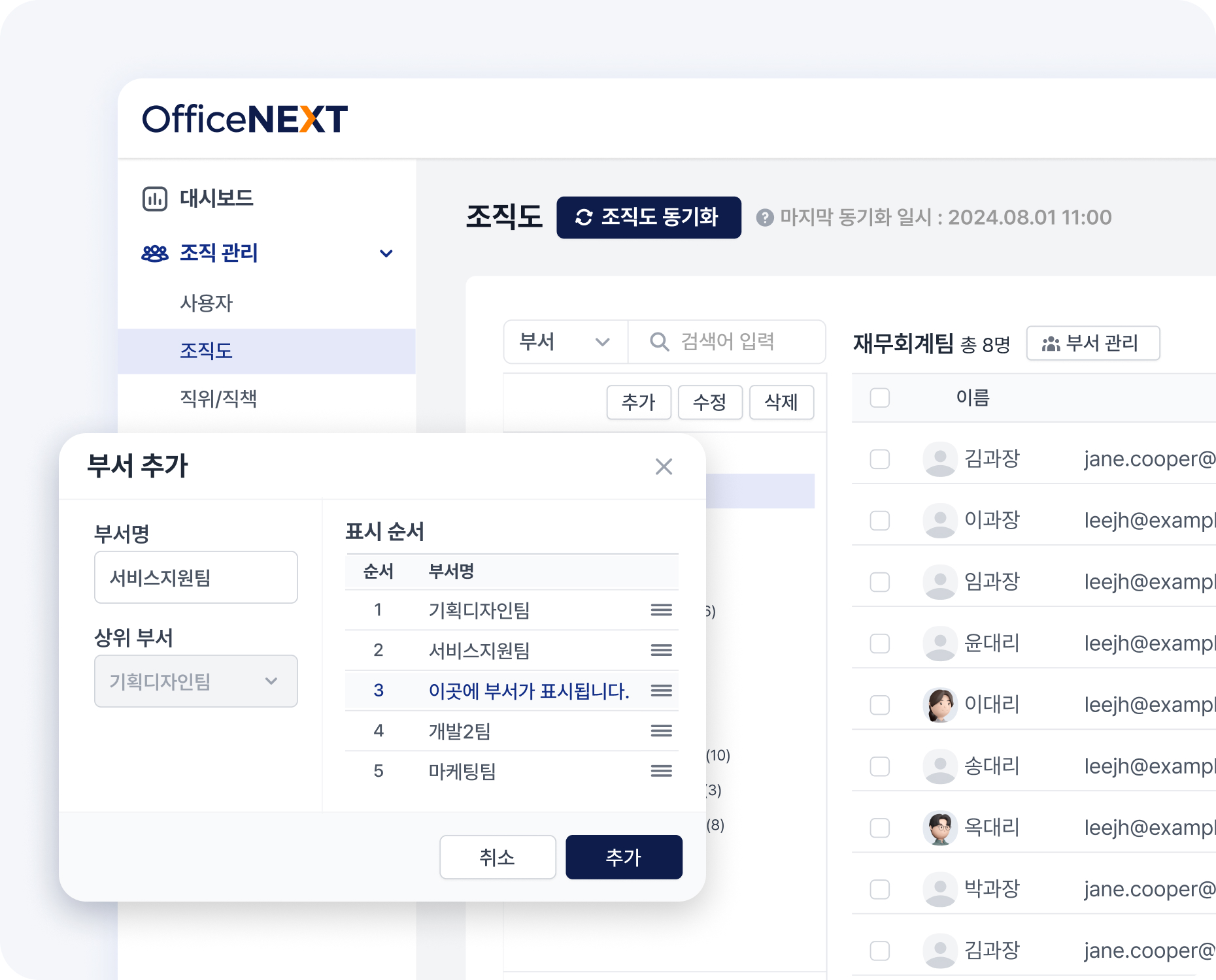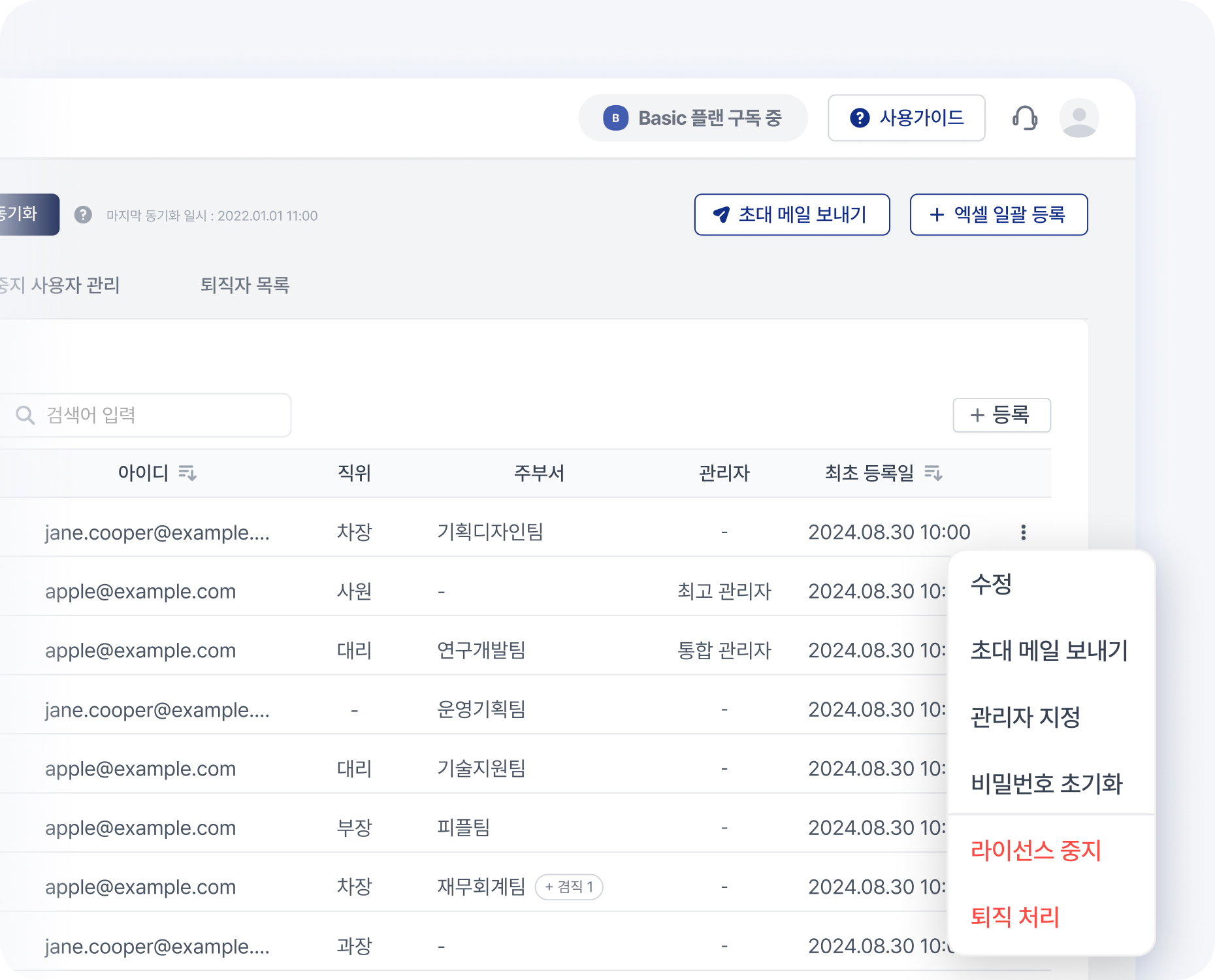 관리자 플랫폼에서 회사의 조직도(사용자, 부서, 직위/직책)를 등록하고 관리할 수 있어요. 관리자는 편리하게 회사별 맞춤 조직도를 등록하고 필요에 따라 신속하게 변경할 수 있습니다.