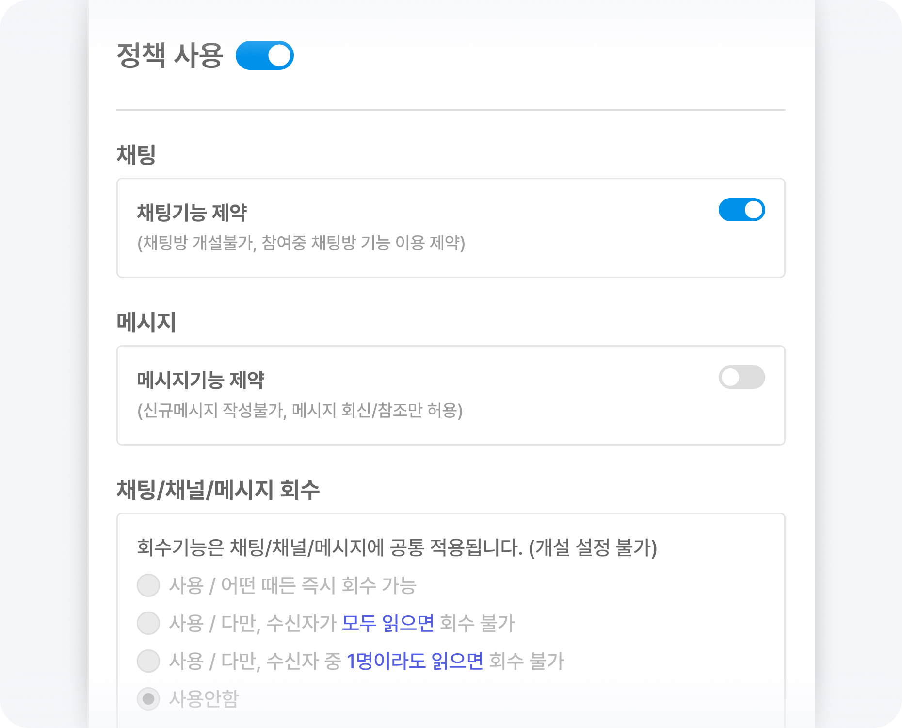 메신저 설치 여부 및 설치 기기, OS, IP 대역에 대한 정보를 확인할 수 있습니다. 또한 사용자별로 채팅, 채널, 메시지 발송 제어 및 회수 기능을 사용 가능 여부를 관리할 수 있어 보안과 사용성을 높일 수 있습니다.