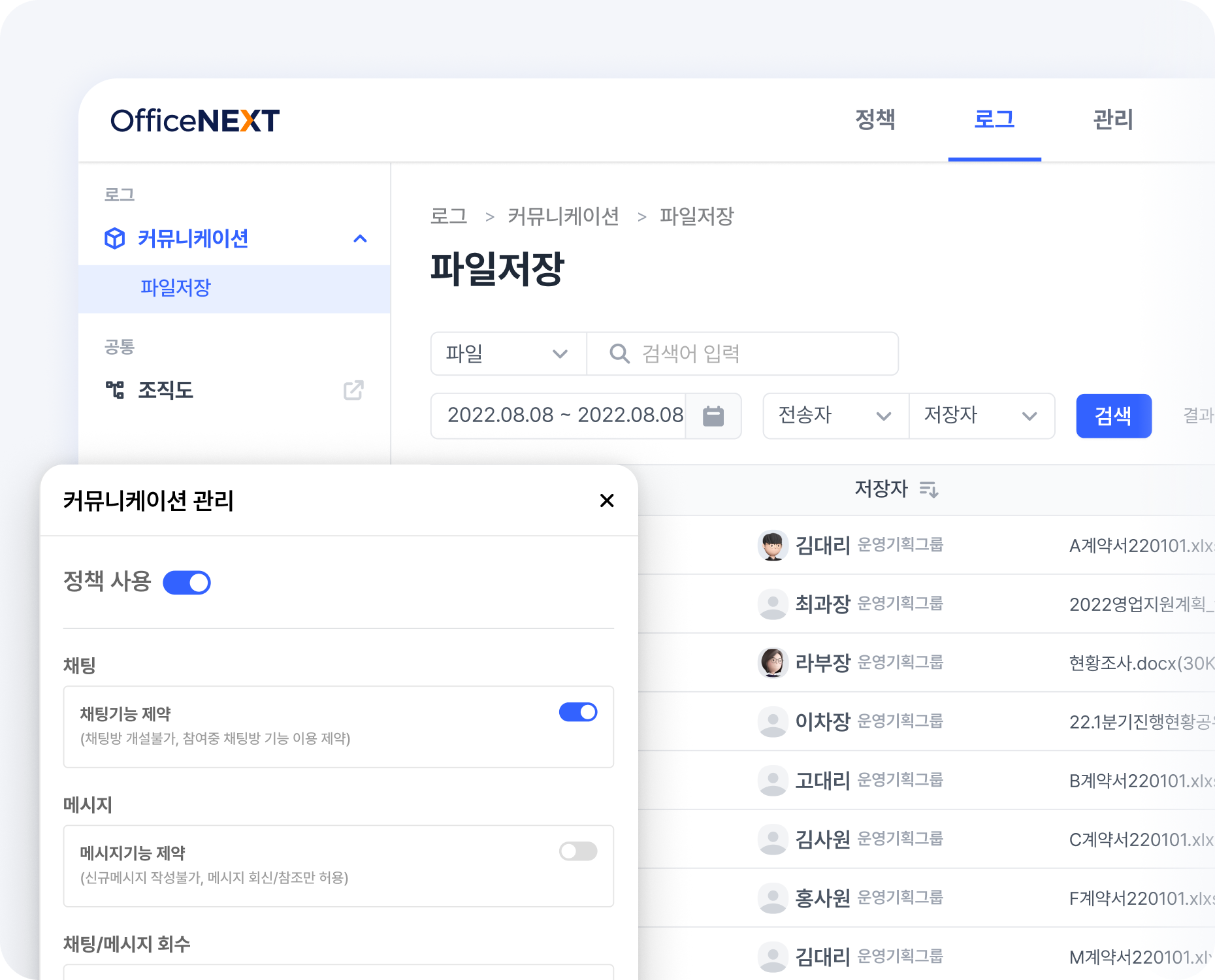 오피스챗에 첨부된 파일의 전송자, 저장자, 파일명, 저장일은 모두